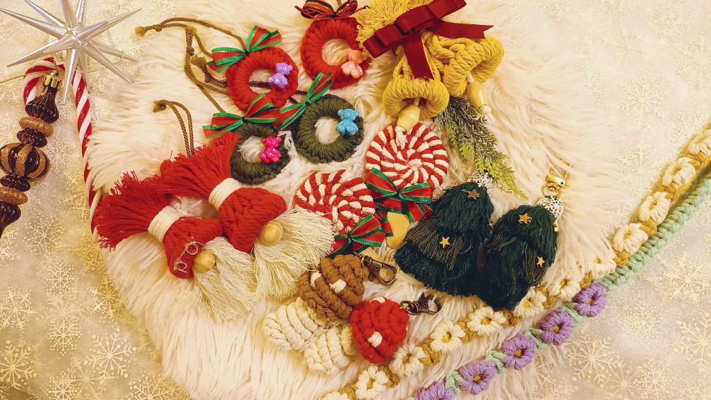 マクラメ編みでクリスマスにふさわしいチャームを作りました。