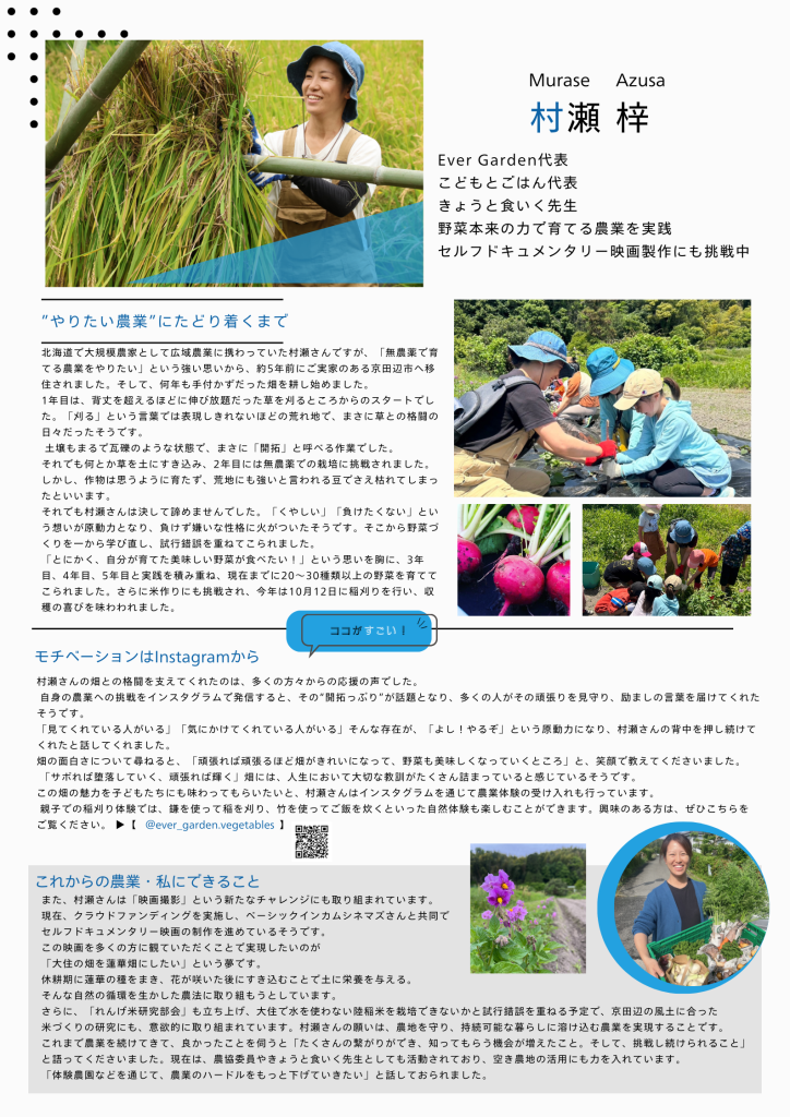 今回ご紹介するのは、野菜本来の力で育てる農業を実践する 村瀬 梓 さんです。