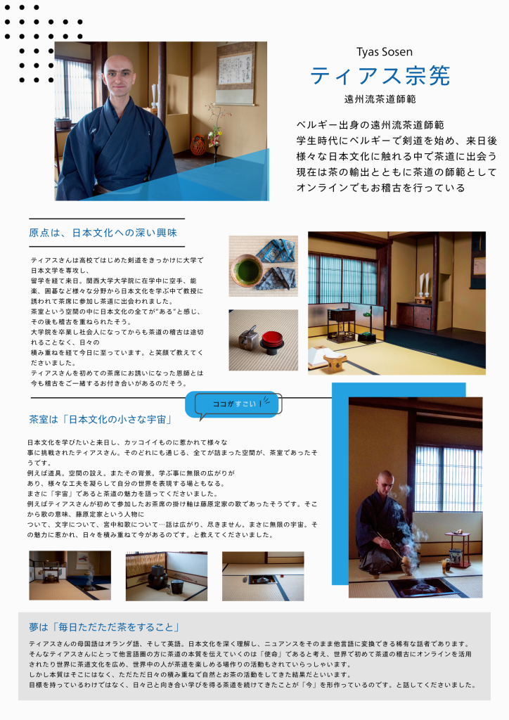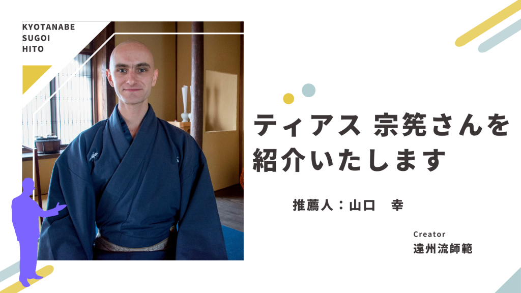 今回ご紹介するのは、茶道遠州流師範 ティアス宗筅 さんです。