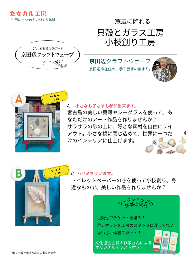 京田辺クラフトウェーブさんによる、「貝殻とガラス工房」「小枝創り工房」です。